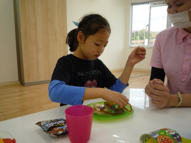 おやつは個別包装になっているのですが、手先を動かすイメージが掴みにくく袋を開けられない子は『先生、開けて』とスタッフに声をかけてくれます。自分で開けようとがんばっている子には、スタッフも最初から声をかけず見守り、時にはサポートしています。